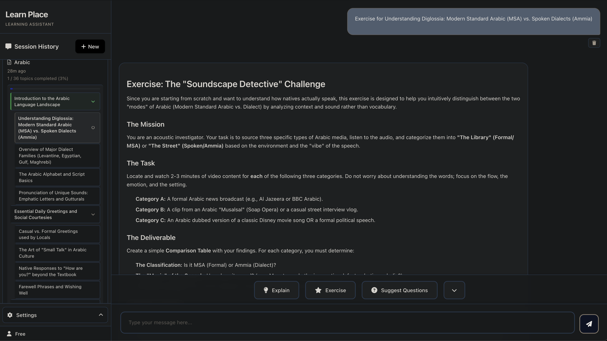 Custom Syllabus Generation: At the start you input your goal, background, what you already know (current personal experience). Learn Place AI then produces a fully structured curriculum tailored to you.